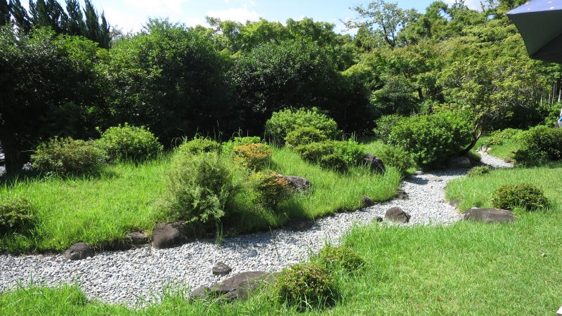 山縣は作庭に秀で、特徴として、自然地形を利用した築山状の盛り土で水源としての山地を表現、芝生による緩やかな起伏の中に浅い水景がある伸びやかな景観を好み、石が隠れない程度の水量で底石の間を流れる音を楽しんでいたと考えられます。