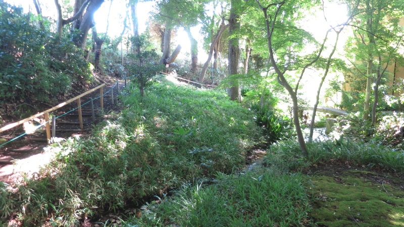 庭園は、谷水を巡らせ、高低差を利用していくつかの滝が設えられているとのことです。