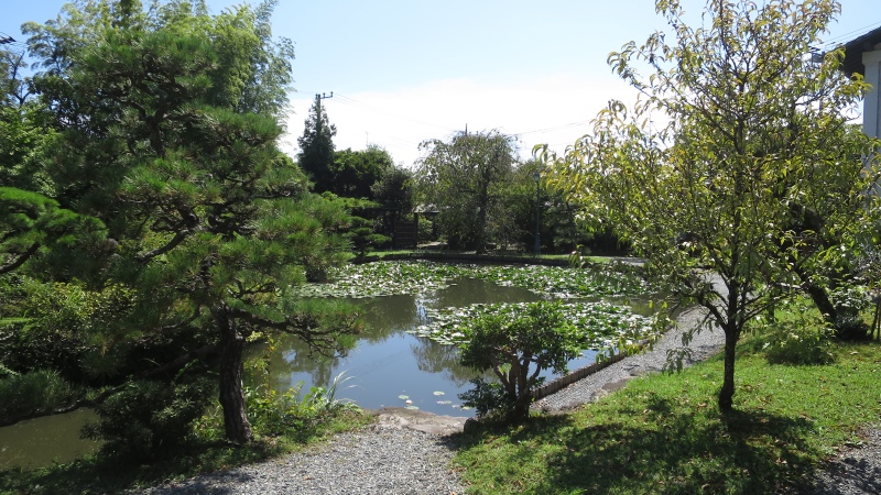 入口を入ったところに、池があります。散策路があって、池の周りを歩くことができます。奥の方に、茶室があります。