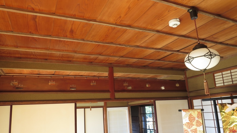 建物は、格式ばらない数寄屋(すきや)風の造りで、平屋と二階家が連なっています。建物内には板絵襖や網代組天井など優れた意匠も見ることができます。