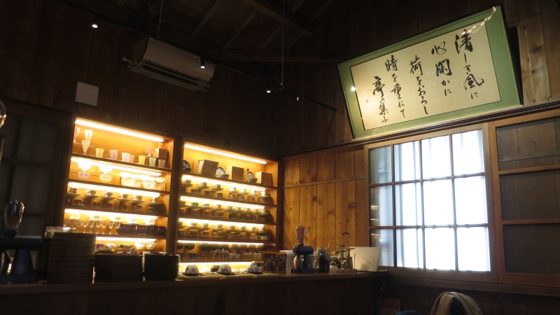 入って正面に額が掛けられ、棚の器はライトアップされていて、綺麗でなかなか良い空間です。