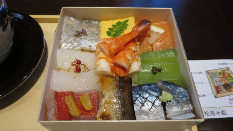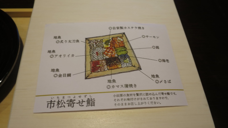 寄せ鮨の器は、使い捨て。上に解説の紙が置かれていて、分かりやすいです。なかなか合理的ですね。