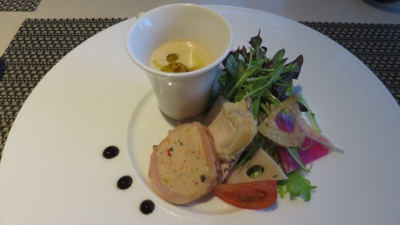 チキンマランティヌ。鶏肉の中に、鶏と豚の混ぜた料理が詰められています。鶏があっさりですが、ジューシーでした。そのほか、パプリカや野菜など。蓮根がパリッと美味しかったです。