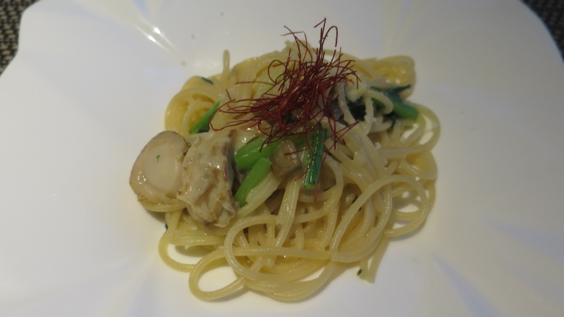 豆乳生クリームに、柚子が入り、糸唐辛子が乗っています。一見あっさりなのですが、貝柱、ベビー帆立の出汁が出ていて、豆乳クリームがちょっとクリーミーで、味わい深かったです。