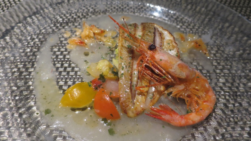今日のお魚は、日本海産イトヨリダイ。甘エビのフリットに、桜海老、エシャロットが乗っています。イトヨリダイがあっさりとしている中で、出汁でメリハリが効いていて、エビも香ばしくて良かったです。ワインと一緒にいただきたくなるお料理です。