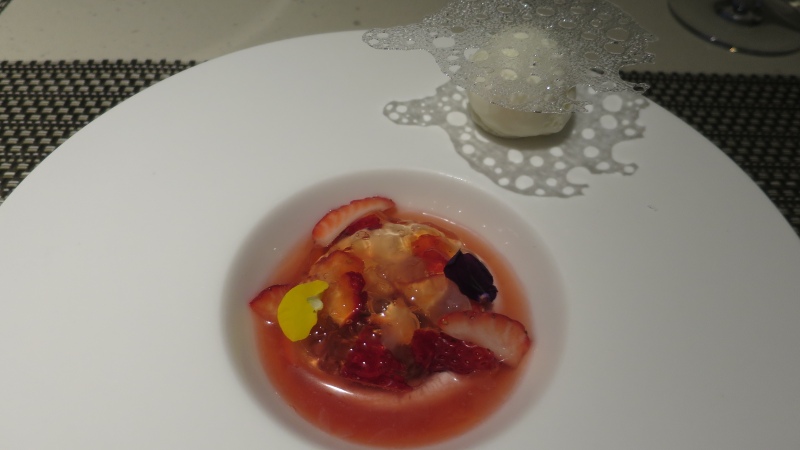 デザートは、「苺とホワイトチョコレートのムース」です。イチゴは、紅ほっぺ。ナタデココも入っています。そして、お皿の縁には、クリームチーズアイスです。