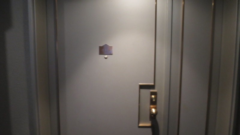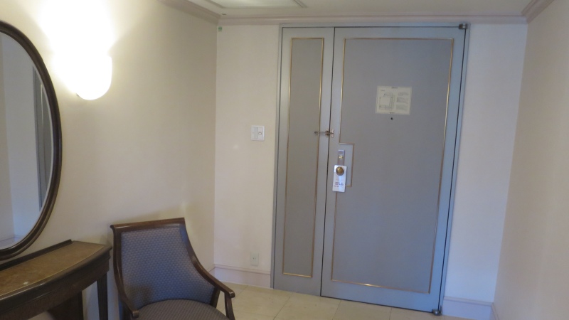 入口を入り、扉の方を振り返ったところです。ちょっと広めの前室で、なぜかここに椅子と鏡台があります。