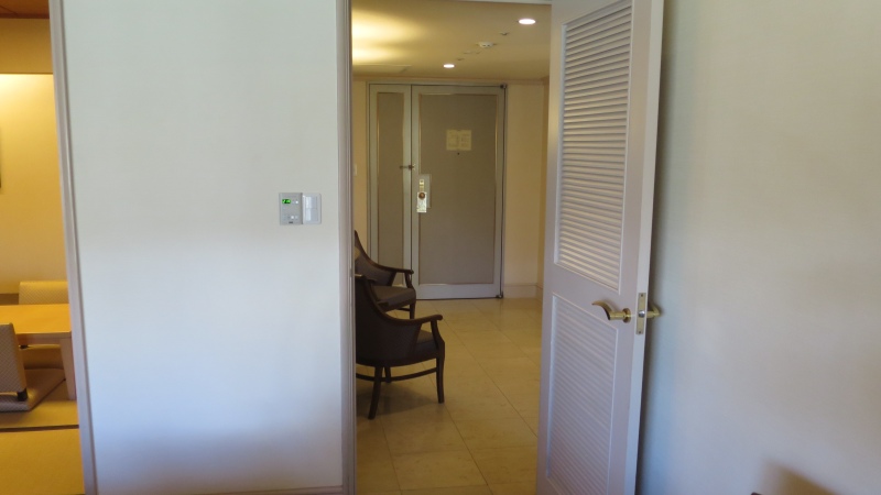 お部屋の方を見るとこんな感じ。右側の扉がリビングルーム、真ん中の扉がベッドルームで、左側の扉が洗面スペース等です。