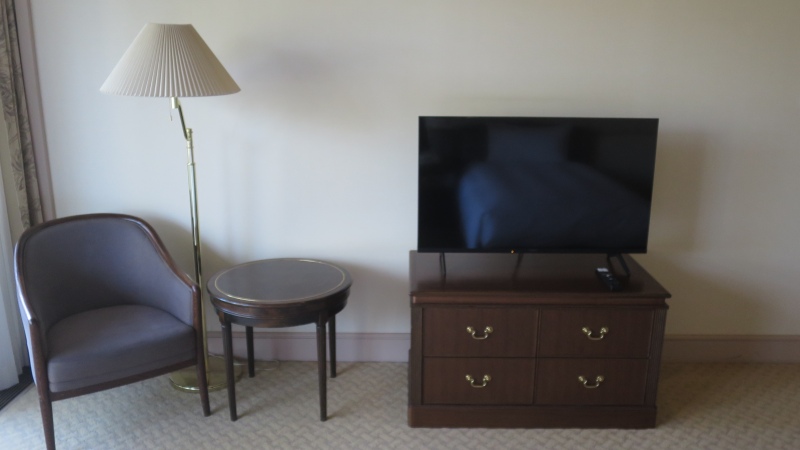ベッドの足元の壁側に、テレビと小さなテーブルに椅子があります。