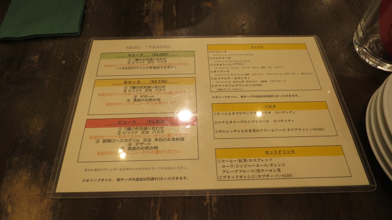 Aコース(2,090円)は、7種の前菜盛り合わせ、ピッツァ又はパスタ。ドリンクは、+220円です。