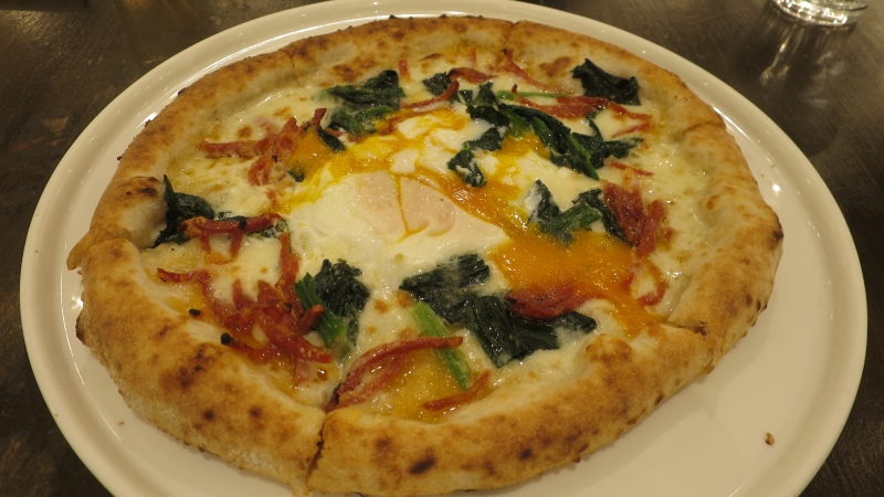 熱々で、ピリ辛サラミと玉子、ちょっとほうれん草も乗っていて、このピッツァは、美味しかったです。