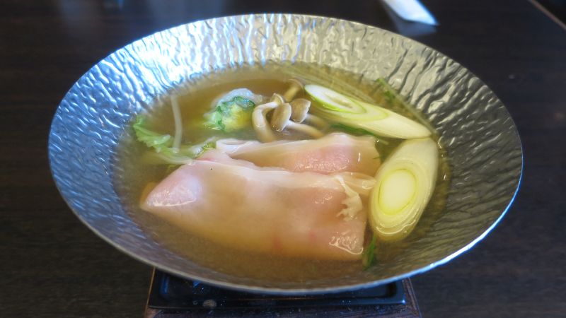 お鍋は、白河高原清流豚です。ネギやキャベツ、キノコも入って、美味しかったです。