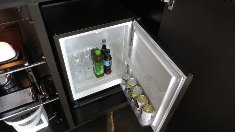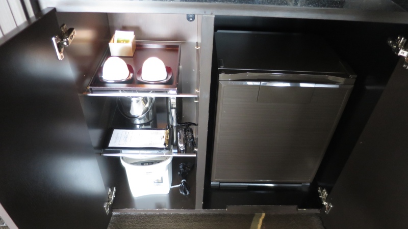 台の下の開きには、左側にポットなど、右側に冷蔵庫です。