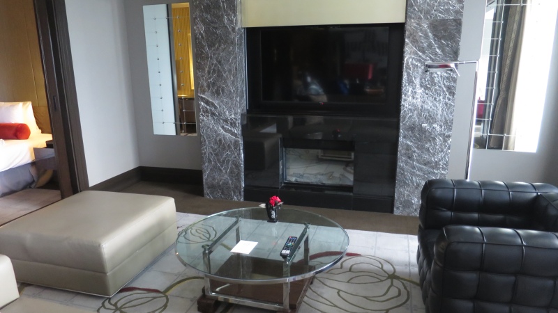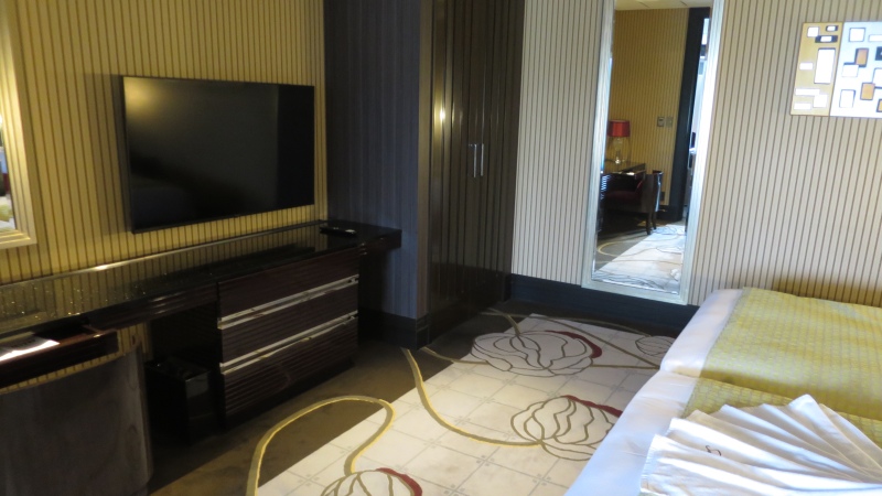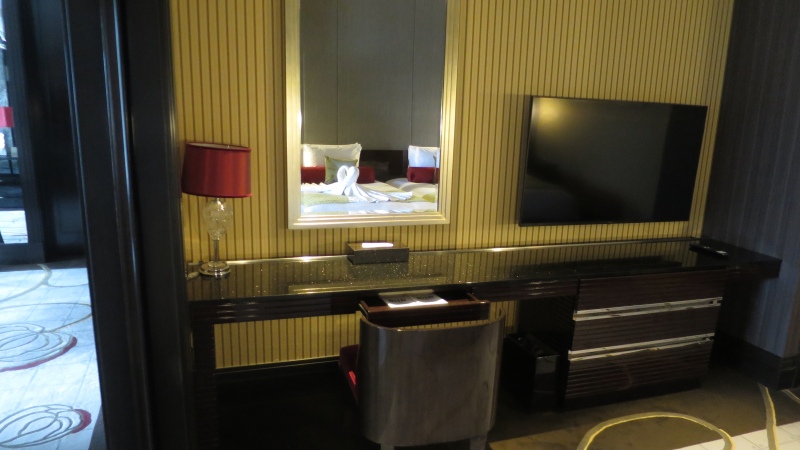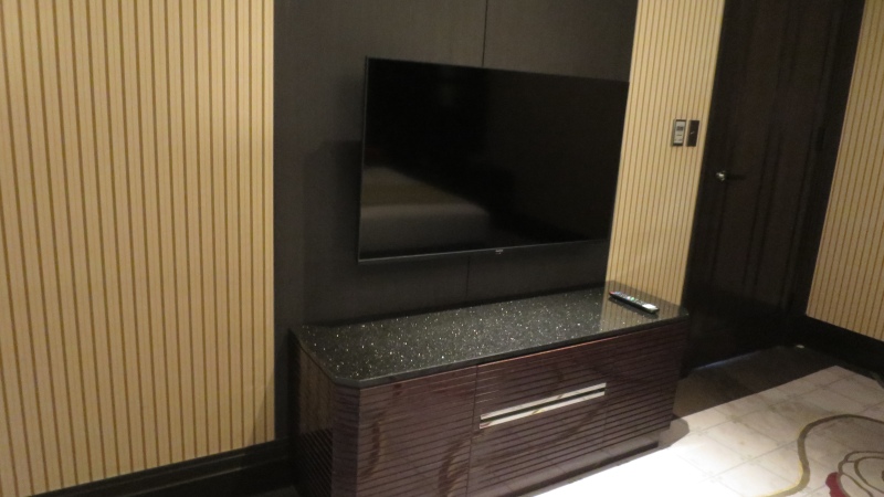 そして、その手前にデスクがあり、テレビがベッドの正面の壁にかかっています。