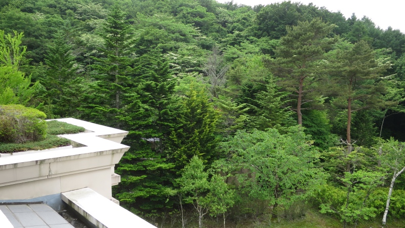 右端がお部屋のバスルーム、その左側の緑の中にかすかに見えるのがパブリック棟です。