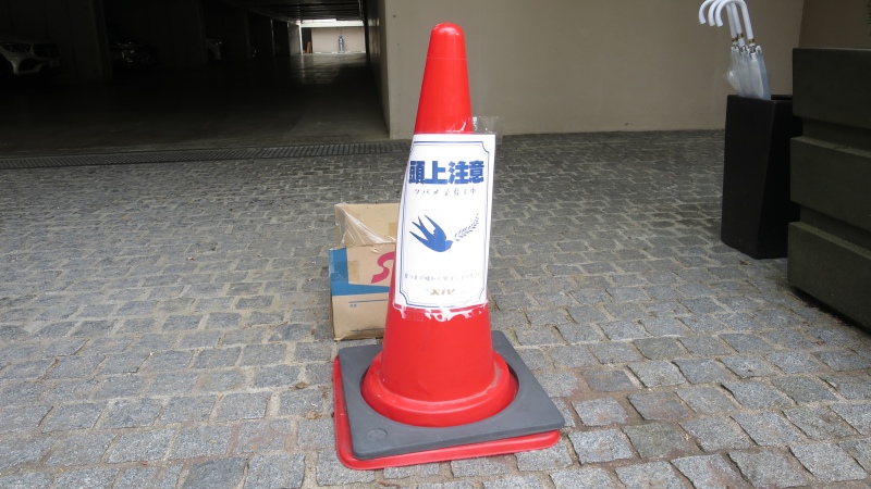 駐車場の入口。「頭上注意」の髪が置かれていました。