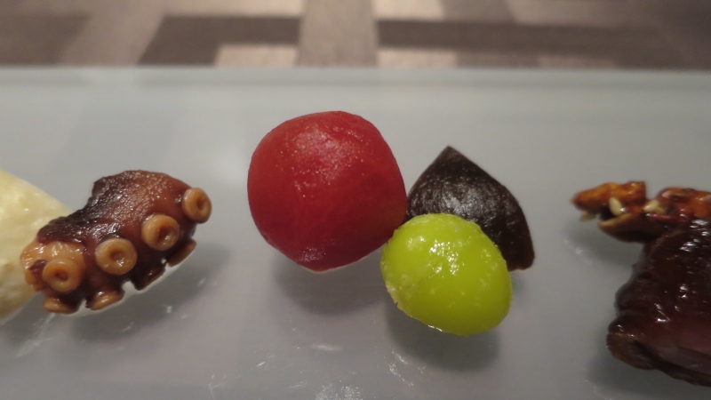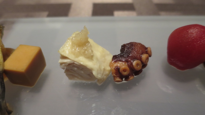 いろいろと乗っています。チーズ薫製、茄子ときくらげ。鶏ねぎしおと蛸。ライチートマト、枝豆にしいたけ。叉焼と胡桃のあめ煮。