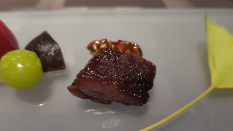 叉焼と胡桃のあめ煮。右端のイチョウの葉は、もちろん飾りです。