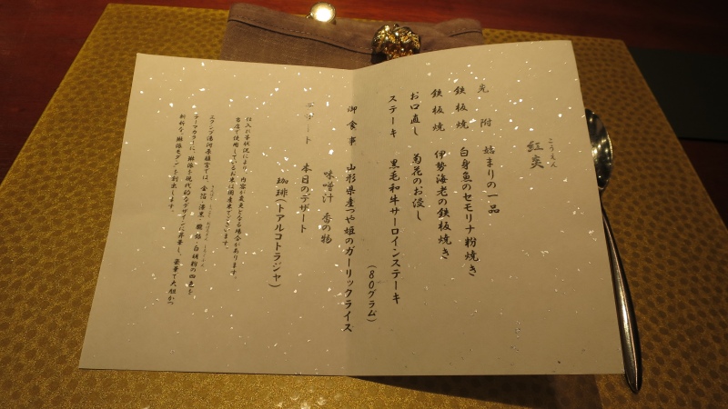 湯河原離宮の鉄板焼「紅炎」のコース。16,000円(税サ込19,360円)です。