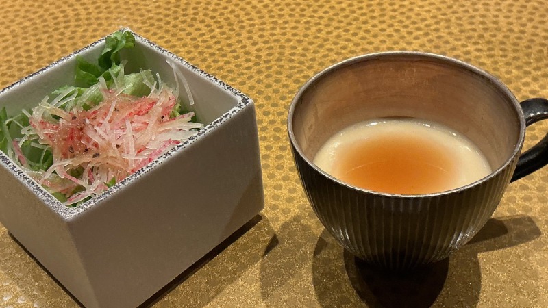 先付。「始まりの一品」は、サラダと茶わん蒸しです。