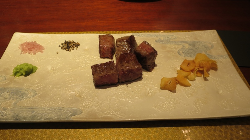 「黒毛和牛サーロインステーキ(80グラム) ニンニクチップ 本山葵 赤ワイン塩 黒胡椒」です。